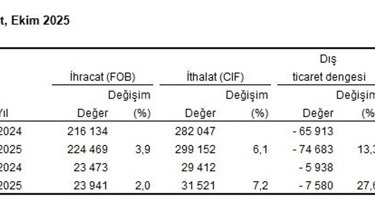 TÜİK, Ekim 2025 dönemine ilişkin dış ticaret istatistiklerini açıkladı. Buna göre; ihracat 2025 yılı Ekim ayında, bir önceki yılın aynı ayına göre yüzde 2 artarak 23 milyar 941 milyon dolar, ithalat yüzde 7,2 artarak 31 milyar 521 milyon dolar olarak gerçekleşti. İhracat 2025 yılı Ocak-Ekim döneminde bir önceki yılın aynı dönemine göre yüzde 3,9 artarak 224 milyar 469 milyon dolar, ithalat yüzde 6,1 artarak 299 milyar 152 milyon dolar olarak gerçekleşti.
