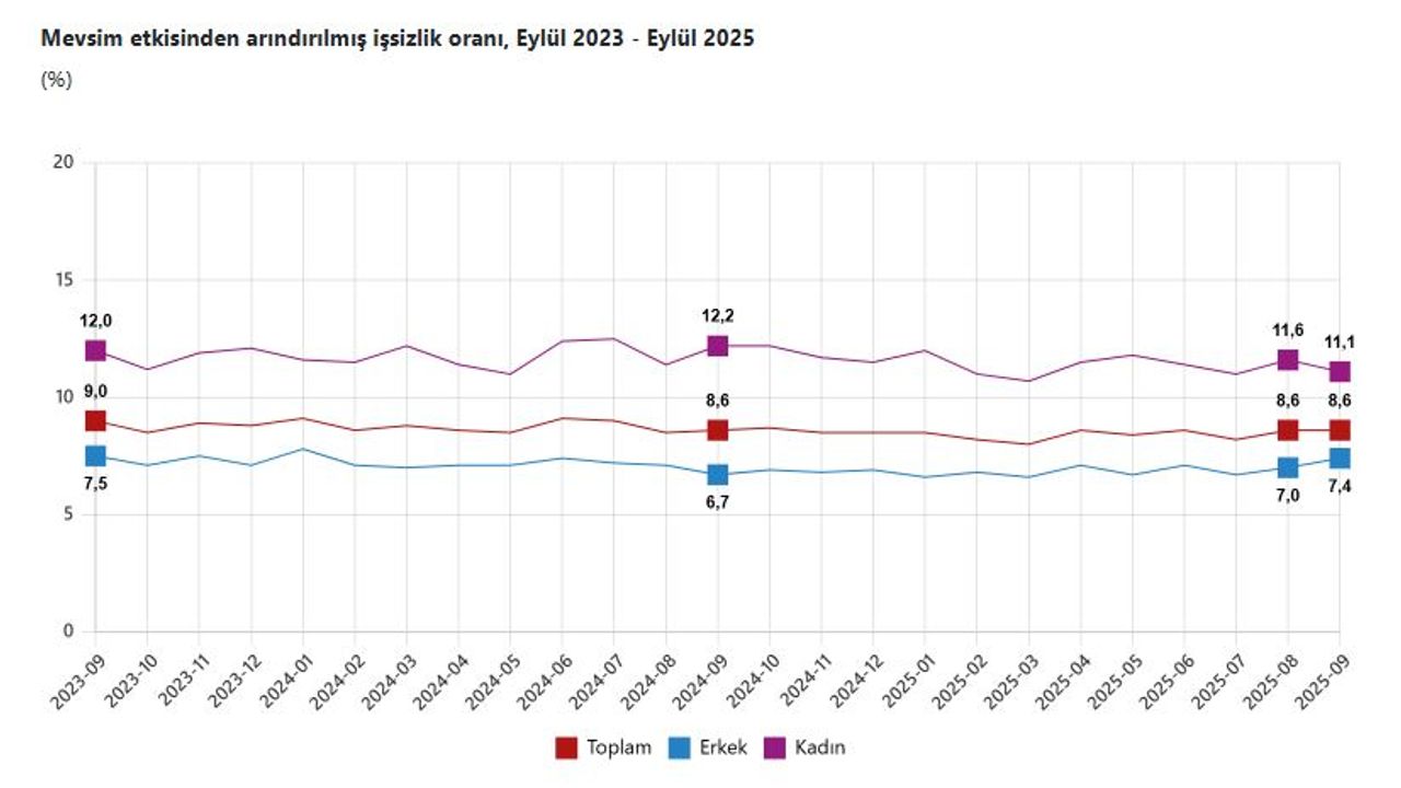TÜİK, Eylül 2025 dönemine ilişkin iş gücü istatistiklerini açıkladı. Buna göre; 15 ve daha yukarı yaştaki kişilerde işsiz sayısı 2025 yılı Eylül ayında bir önceki aya göre 12 bin kişi artarak 3 milyon 75 bin kişi oldu. İşsizlik oranı değişim göstermeyerek yüzde 8,6 seviyesinde gerçekleşti. İşsizlik oranı erkeklerde yüzde 7,4 iken kadınlarda yüzde 11,1 olarak kaydedildi. İstihdam edilenlerin sayısı 2025 yılı Eylül ayında bir önceki aya göre 200 bin kişi azalarak 32 milyon 491 bin kişi, istihdam oranı ise 0,3 puan azalarak yüzde 48,9 oldu. Bu oran erkeklerde yüzde 66,3 iken kadınlarda yüzde 31,8 olarak gerçekleşti. İş gücü, 2025 yılı Eylül ayında bir önceki aya göre 188 bin kişi azalarak 35 milyon 566 bin kişi, iş gücüne katılma oranı 0,3 puan azalarak yüzde 53,5 olarak gerçekleşti. İş gücüne katılma oranı erkeklerde yüzde 71,6 iken kadınlarda yüzde 35,7 oldu.