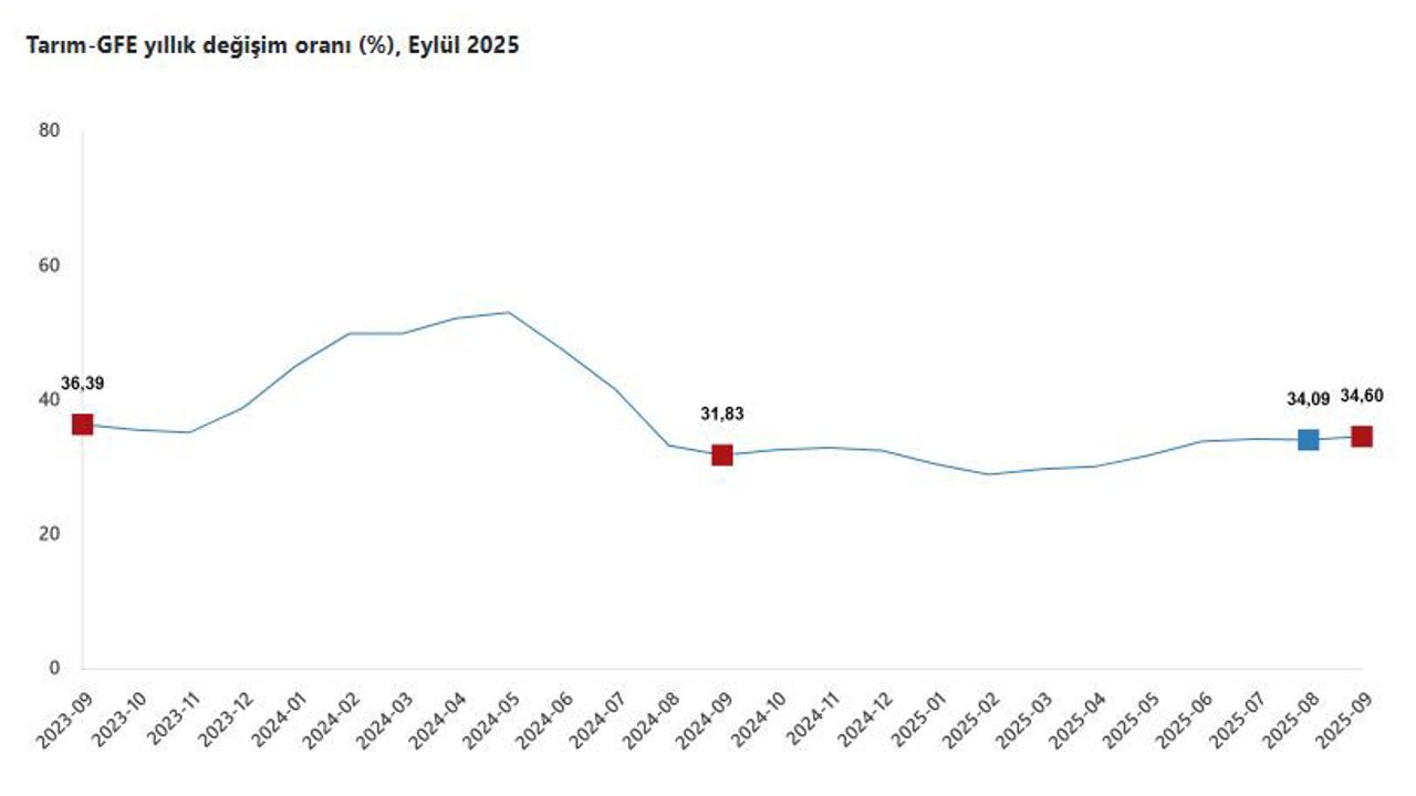 TÜİK, Eylül 2025 dönemine ilişkin tarımsal girdi fiyat endeksi verilerini açıkladı. Buna göre; tarımsal girdi fiyatları 2025 yılı Eylül ayında bir önceki aya göre yüzde 2,16, bir önceki yılın aralık ayına göre yüzde 26,48, bir önceki yılın aynı ayına göre yüzde 34,60 ve 12 aylık ortalamalara göre yüzde 32,19 arttı. Ana gruplarda bir önceki aya göre; tarımda kullanılan mal ve hizmetler endeksinde yüzde 2,29 artış, tarımsal yatırıma katkı sağlayan mal ve hizmetler endeksinde yüzde 1,35 artış gerçekleşti. Bir önceki yılın aynı ayına göre tarımda kullanılan mal ve hizmetler endeksinde yüzde 36,01 artış, tarımsal yatırıma katkı sağlayan mal ve hizmetler endeksinde yüzde 26,60 artış gerçekleşti. Yıllık değişimin en yüksek olduğu alt grup yüzde 56,97 artış ile veteriner harcamaları, aylık değişimin en yüksek olduğu alt grup yüzde 6,76 artış ile tohum ve dikim materyali oldu. (DHA)