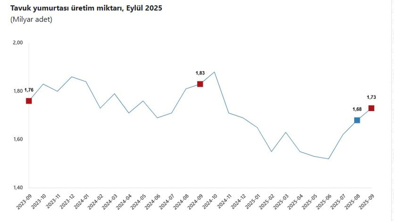 TÜİK, Eylül 2025 dönemine ilişkin kümes hayvancılığı ile süt ve süt ürünleri üretimi istatistiklerini açıkladı. Buna göre; bir önceki ay 229 bin 965 ton olan tavuk eti üretimi eylül ayında yüzde 0,5 oranında azalarak 228 bin 846 ton oldu. Bir önceki ay 1 milyar 679 milyon 706 bin adet olan tavuk yumurtası üretimi eylül ayında yüzde 3,1 oranında artarak 1 milyar 731 milyon 478 bin adet oldu. Eylül ayında bir önceki yılın aynı ayına göre, tavuk yumurtası üretimi yüzde 5,3 azaldı, kesilen tavuk sayısı yüzde 6,3 arttı, tavuk eti üretimi yüzde 6,9 arttı. Ocak-eylül döneminde bir önceki yılın aynı dönemine göre, tavuk yumurtası üretimi yüzde 8,9 azaldı, kesilen tavuk sayısı yüzde 10,3 arttı, tavuk eti üretimi yüzde 12,7 arttı.