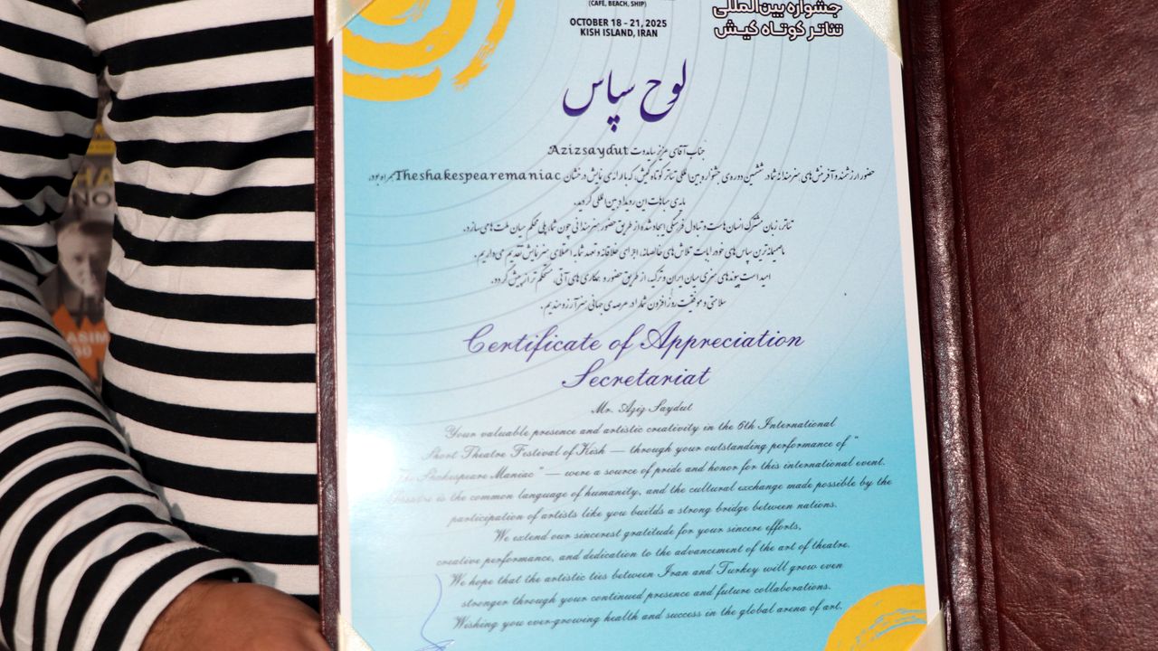 VANLI 26 yıllık tiyatro sanatçısı 2 çocuk babası Aziz Saydut (48), İran’ın Kiş Adası’nda 18-21 Ekim tarihleri arasında düzenlenen ve 4 ülkeden sanatçıların katıldığı '6'ncı Uluslararası Kısa Tiyatro Festivali'nde, 'Shakespeare Delisi' adlı tek kişilik oyunu ile başarı belgesine layık görüldü. Tek kişilik oyunu ile başarı belgesi aldığını söyleyen Saydut, İran'daki tiyatro anlayışının sahne sınırlarını aşarak farklı mekanlara taşındığını artık gemi, deniz sahili ve kafeteryalarda tiyatro oyunlarının oynandığını söyledi.