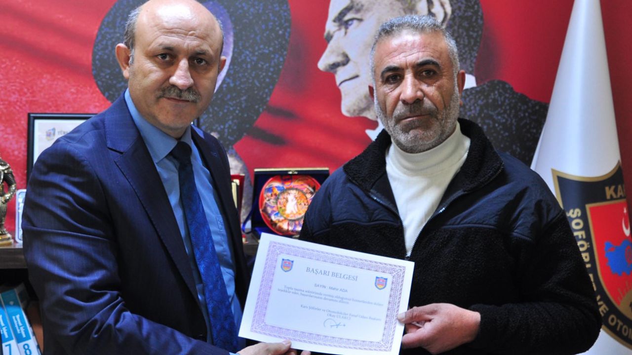KARS'ta kalp krizi geçiren yolcuyu güzergahını değiştirip hastaneye yetiştiren minibüs sürücüsü Mahir Ada, Kars Şoförler ve Otomobilciler Odası Başkanı Okay Ulakcı tarafından plaket ve başarı belgesiyle ödüllendirildi.